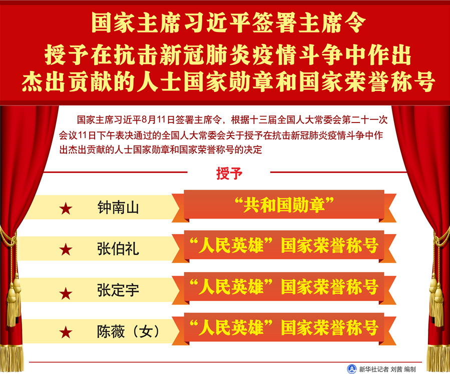 国家主席习近平11日签署主席令,根据十三届全国人大常委会第二十一次会议11日下午表决通过的全国人大常委会关于授予在抗击新冠肺炎疫情斗争中作出杰出贡献的人士国家勋章和国家荣誉称号的决定,授予钟南山“共和国勋章”,授予张伯礼、张定宇、陈薇(女)“人民英雄”国家荣誉称号。