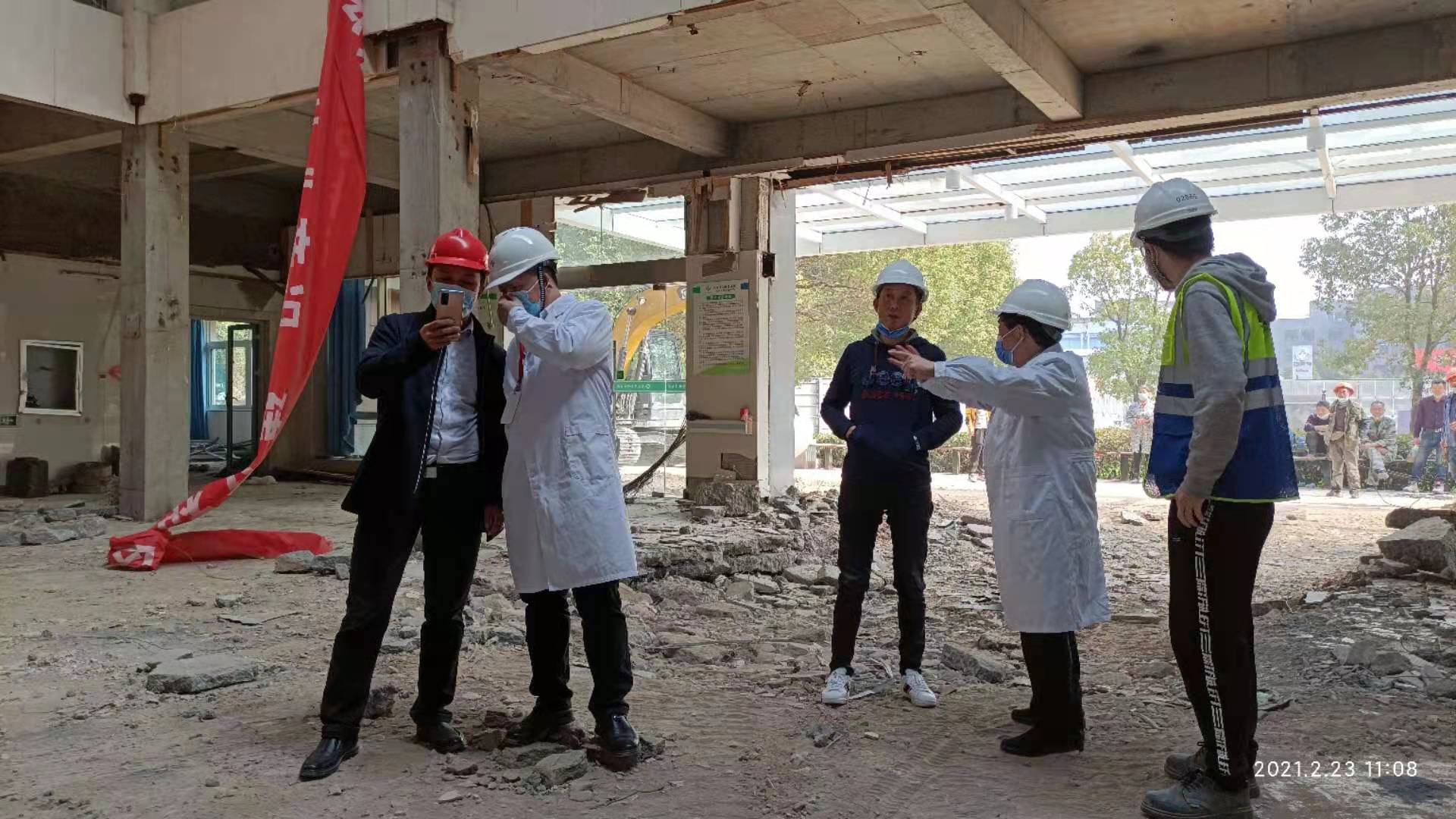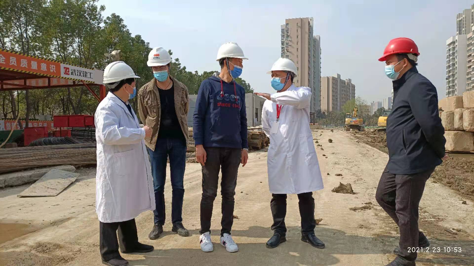 在应急病房楼工地,黄朝林院长仔细询问了项目复工进展、工人返场率、工程计划等情况,他特别强调:要加强工地的疫情防控工作,严格执行测体温、核酸检测等制度,确保疫情安全。