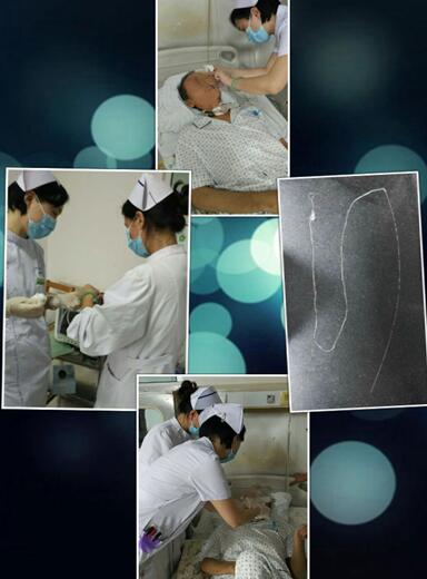 显然情况比我们想象得更困难,弯曲的鼻中隔,患者无法吞咽配合,已经狭小的食管和插着气管套管的喉部。一次又一次地呛咳,一次又一次的盘入口腔,看着患者与家属痛苦和焦急的面容,我们几位在场的护士也汗如雨下。就在我们一筹莫展的时候,程芳护士长提出了一个大胆的想法!她说,如果我们能增加导管前端的硬度,就能更容易通过狭小的喉部空隙。那么问题又来了,如何才能使我们的胃管前端更加有力呢?