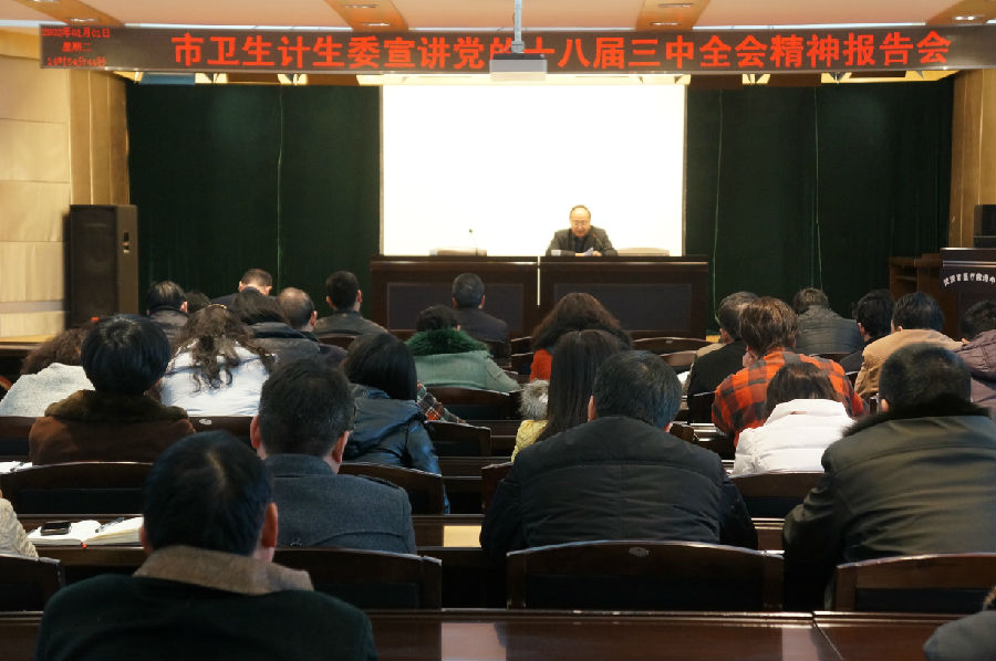 1月21日下午,市卫生计生委宣讲党的十八届三中全会精神报告会在线上德州扑克平台网 举行。市卫生计生委吴克敏巡视员、市医改办陈诗亮常务副主任作宣讲报告。院领导、全体中层干部及一线群众代表共100余人参加了报告会。