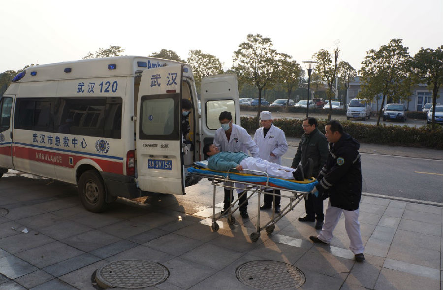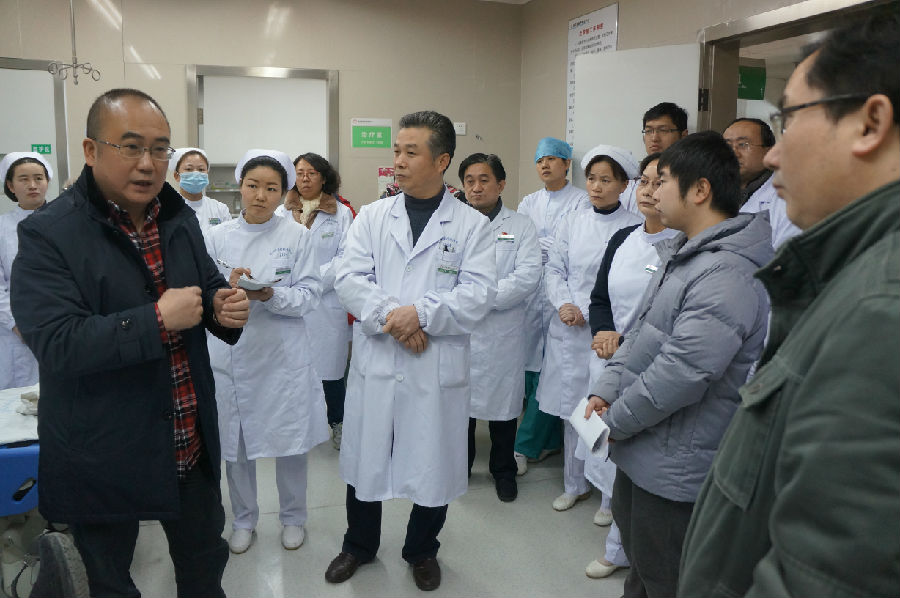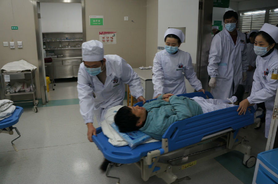 2月11日上午8时30分,一辆救护车呼啸而来,戛然停在线上德州扑克平台 门急诊入口处,听到急救车的鸣笛声,院前急救的医护人员迅速将推车推到急救车前,从车上抬下一位外伤 “患者”。“患者”送至急诊室后,急诊室的医护人员立即投入到抢救工作中,对病人进行了病史询问、体格检查、生命体征监测等情况处理,现场急救人员沉着应对,确保了急救工作的有序展开。
