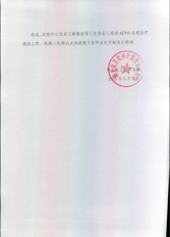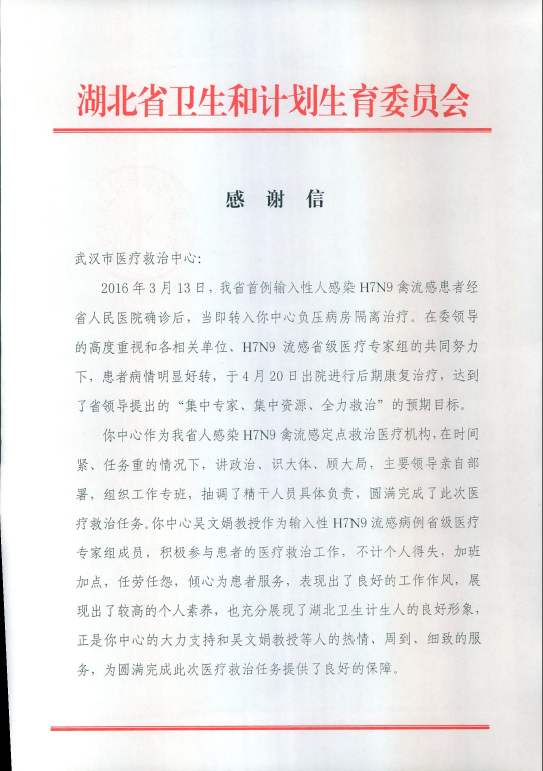 湖北省卫生计生委发感谢信表彰线上德州扑克平台网 在h7n9工作中做出的贡献