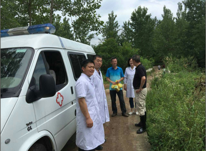 辛冲镇发生溃口后,大量的房屋、农田被淹,道路渍水严重,当应急小分队成员赶到溃口处,看到村民们配合官兵们积极开展封堵溃口的工作,村干部带领着民兵、村民们用手挖,用肩扛,众人抬,争分夺秒的抢筑着防洪堤。队员们一下车就有好几些村民围了上来,说你们来得真是时候,原来当天雨势稍歇,气温攀升,长时间、重体力的抢险工作让好几位村民突发了中暑症状,还有好些村民发生磕撞的外伤,小分队的成员没来得及休息,立刻给村民们消毒、包扎、上药,将救治后的中暑村民抬上救护车休息。在治疗完现场所有的患者后,小分队的成员还为大家讲解了在抢险过程中该如何做好防护,以及水患灾害后如何预防各类传染性疾病。最后应急小分队还为辛冲镇政府和奋战在抢险现场的人员们赠送了近万元的矿泉水、方便面、面包以及感冒药、消炎药、防中暑药、急救药品等。