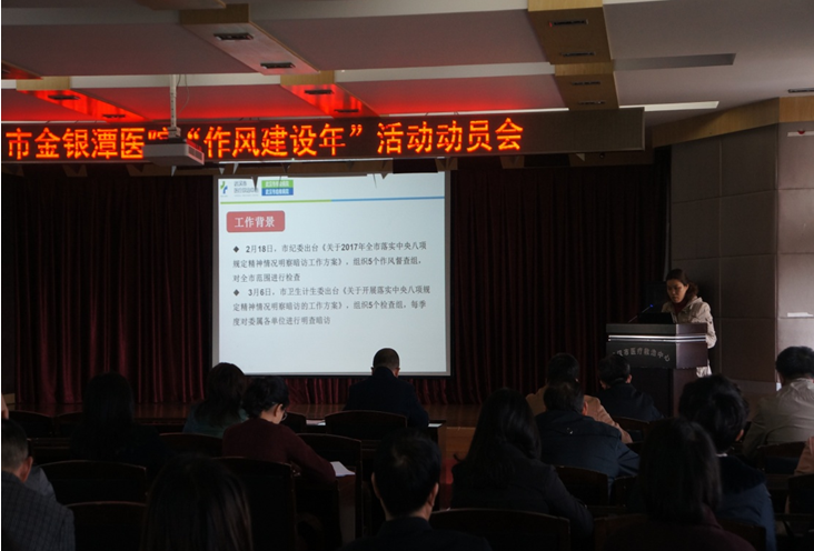 为进一步贯彻全市机关作风建设大会和市卫生计生委党风廉政建设工作会议精神,坚决整顿“新衙门作风”,形成正风提效的新常态,市线上德州扑克平台网 党委决定,在全院开展“作风建设年”活动。3月31日,线上德州扑克平台 在院学术报告厅召开“作风建设年”活动动员大会,会议由党委书记王先广同志主持,院领导班子成员及全体中层干部参加会议。