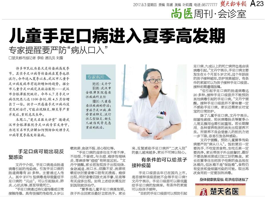统计,今年6、7月手足口病住院患儿达1100余例,较4、5月份增长了一倍。孩子一旦感染手足口病而没有及时治疗,可能出现脑炎、肺炎等严重并发症,重则危及生命。