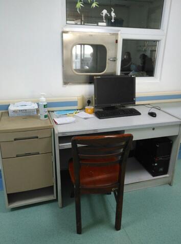 这是我们科室的一个特点,在走廊尽头放着一张写字桌和电脑,痰杯等消毒用品。当一位新病人来了后,直接在门口接待,带入病房,呼叫医生护士在病房内诊疗。这样充分让内走道保持清洁区域。