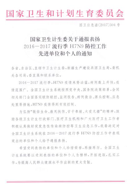 《关于通报表扬2016-2017流行季H7N9防控工作先进单位和个人的通知》