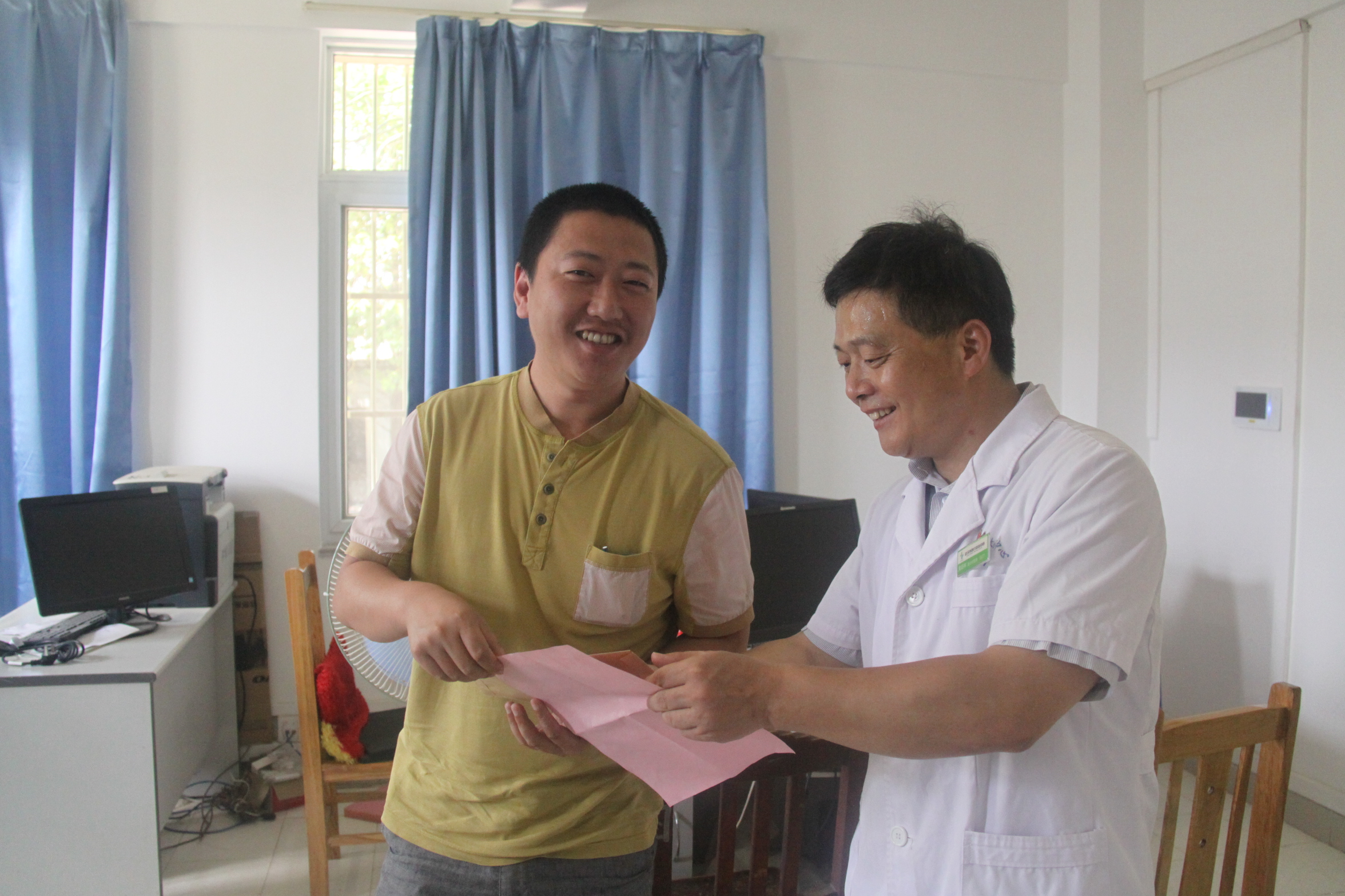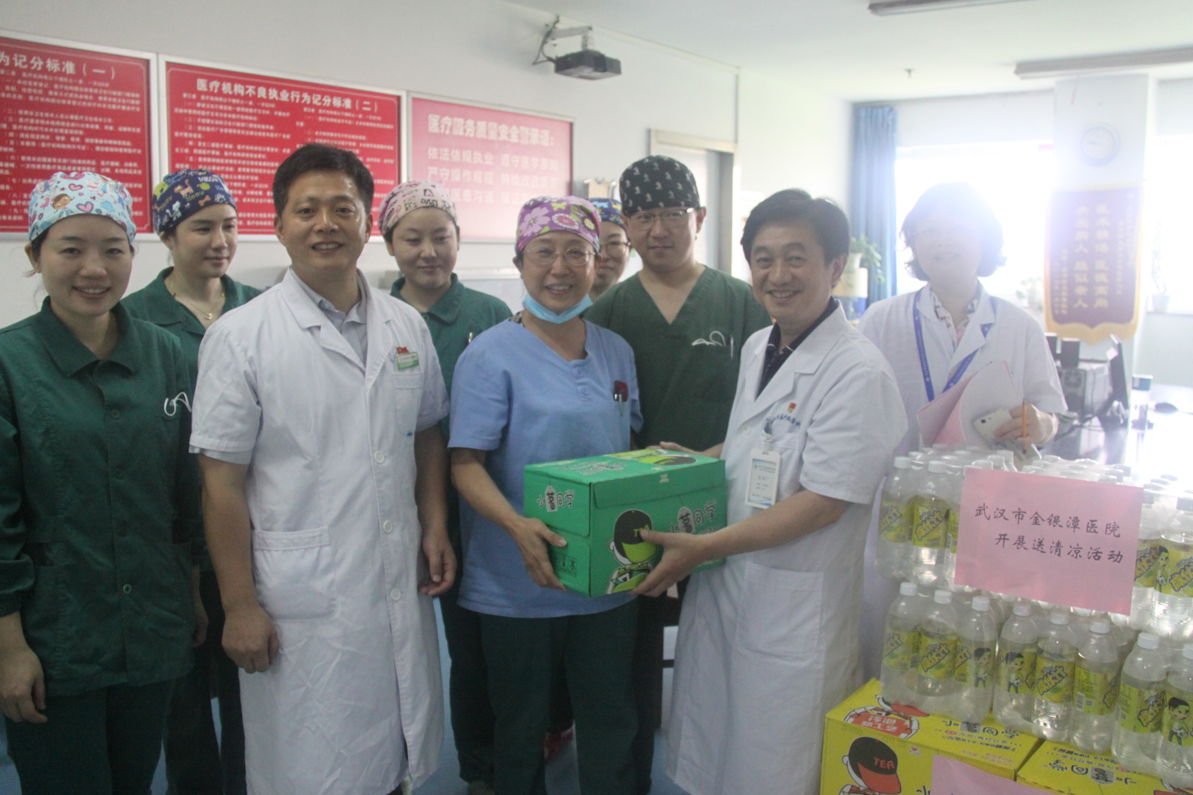 上午9时,党委书记王先广、副院长黄朝林一行6人来到结核病房、综合病房,慰问奋战在医疗岗位上的医护人员,为他们送上咸汽水、饮料等高温慰问品。王书记每到一处都叮嘱科室负责人,加强科室管理,注意医疗安全,合理安排职工工作和休息时间,劳逸结合。特别是在高温酷暑的天气,更需要我们医务人员把工作做细做实,发扬无私奉献精神全心全意为病人服好务。对八一建军节仍坚守岗位的吴志强等转业、复员军人进行了节日慰问,并送上慰问品和慰问信。