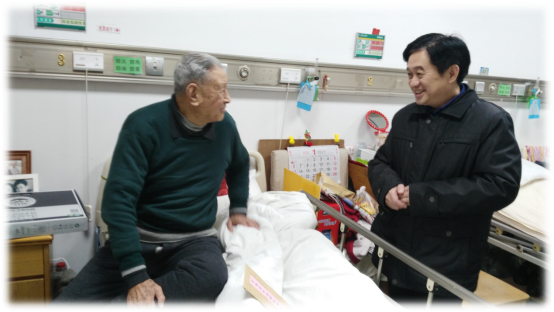 在市中心线上德州扑克平台 老干部病房,王书记与离休干部陶凤歧亲切交谈,关切地询问生活起居及身体状况,介绍线上德州扑克平台 发展情况,祝福他新年快乐、身体健康!