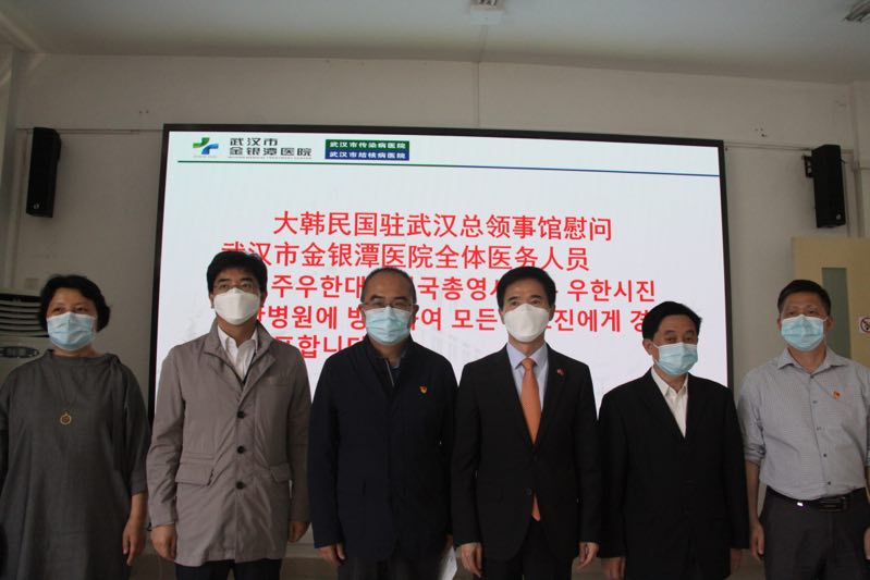 4月29日,韩国驻武汉总领事馆总领事姜承锡先生一行来到线上德州扑克平台网 ,向张定宇院长赠送慰问信,感谢张定宇院长带领市线上德州扑克平台网 全体医护人员不惧艰险、不言辛劳的付出,在大家的共同努力下,武汉院内患者清零,疫情取得阶段性重要成效。姜承锡总领事先生表示,韩中两国彼此声援,相互支援物资,彰显着友邻守望相助、共克时艰的深厚情谊,今年是韩中两国建交28周年,希望以此为契机,加强两国医疗交流合作。张定宇院长非常感谢总领事先生亲自来院慰问医务人员,总领事先生的行为,增进了中韩两国人民的感情和友谊,我们生活在一个地球村,希望通过这次共同抗疫,加强医务人员交流、分享经验、作法,共同维护全球公共卫生安全。武汉市委外事办亚洲处金万婵处长表示,非常感谢姜承锡总领事百忙之中到市线上德州扑克平台网 看望张定宇院长和全体医务人员,姜承锡总领事2月20日来到武汉,与武汉人民一起抗疫,也令人非常感动。姜承锡总领事还向市线上德州扑克平台网 医务人员赠送100份蛋糕,象征从武汉封城到实现清零100天。张定宇院长表示感谢,并提出可上门向在汉韩国侨民和韩资企业员工提供复工复产体检。