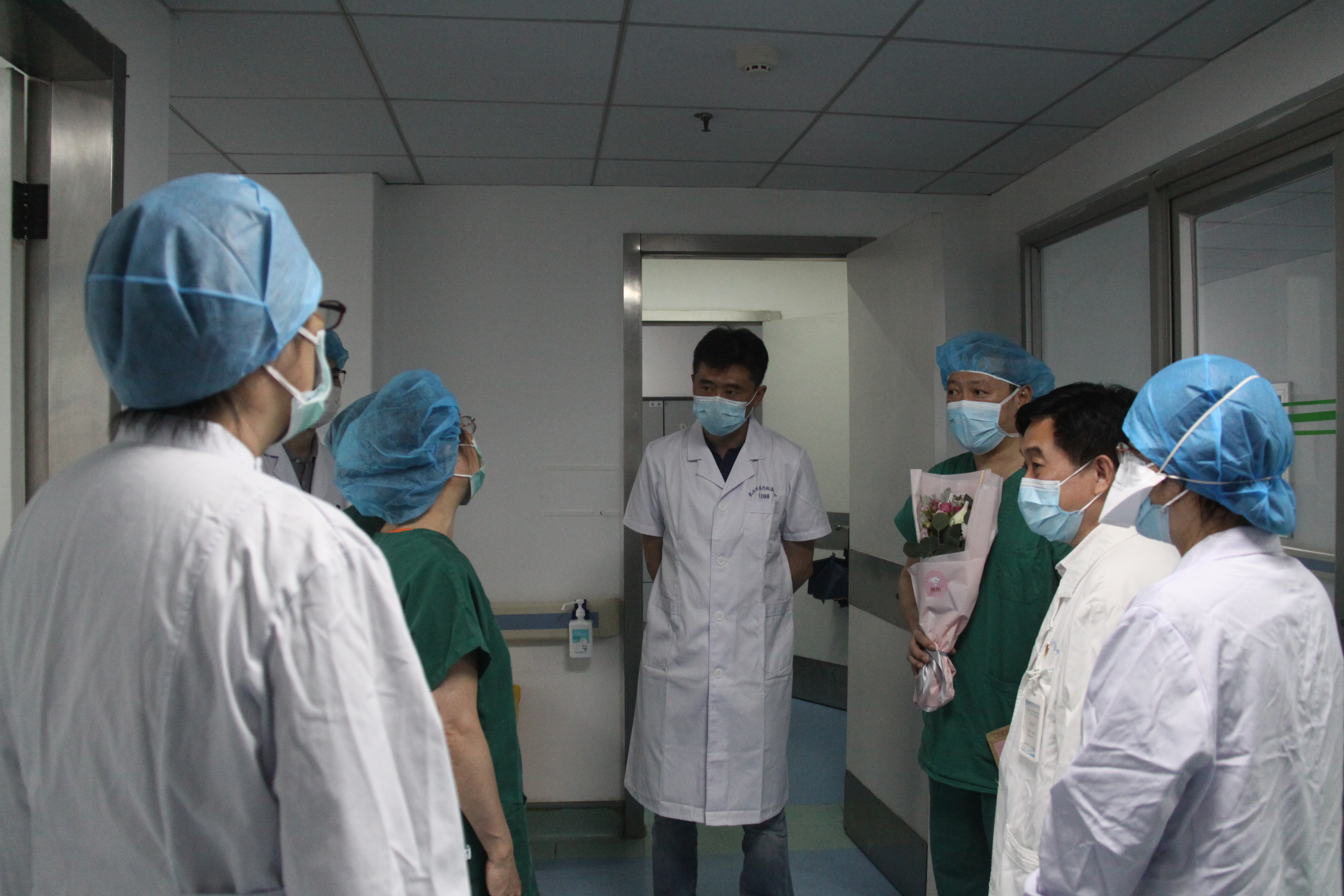 下午4时,南六病区繁忙依旧,病房里不时传来呼叫声,医生们针对病重患者病例进行着讨论,护士们则在一旁进行配药、核对医嘱、查房、做治疗等工作。“感谢大家为抗击新冠肺炎疫情所做的努力,我代表院党委感谢你们!”走进南六病区医生办公室,王书记传达了全市卫生健康系统慰问工作的安排,并与姚书记分别为医务代表吴文娟、瞿昭晖及感染的医务代表杨扬送上慰问花束、水果和一封慰问信。“现在身体情况怎么样?”得知杨扬身体恢复很好后,院领导再次嘱咐大家要注意防护。