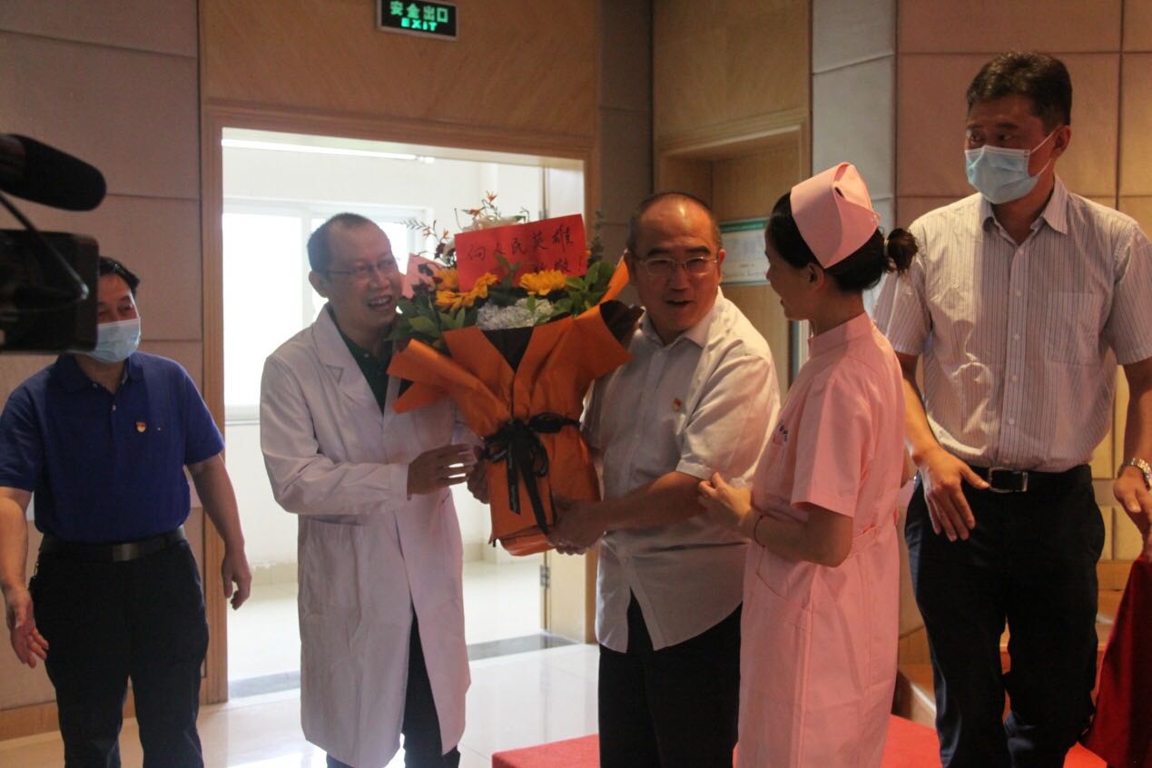 医务人员争先在此合影留念,共同分享这份至高无上的荣誉。看到张院长熟悉的身影出现在会场,全体起立,雷鸣般的掌声经久不息。医护人员特意准备了鲜花,向载誉归来的“人民英雄”——敬爱的张定宇院长致以崇高的敬意。“荣誉不属于我个人,荣誉属于全体职工,属于参加抗疫的所有医务人员!”张院长回应道。