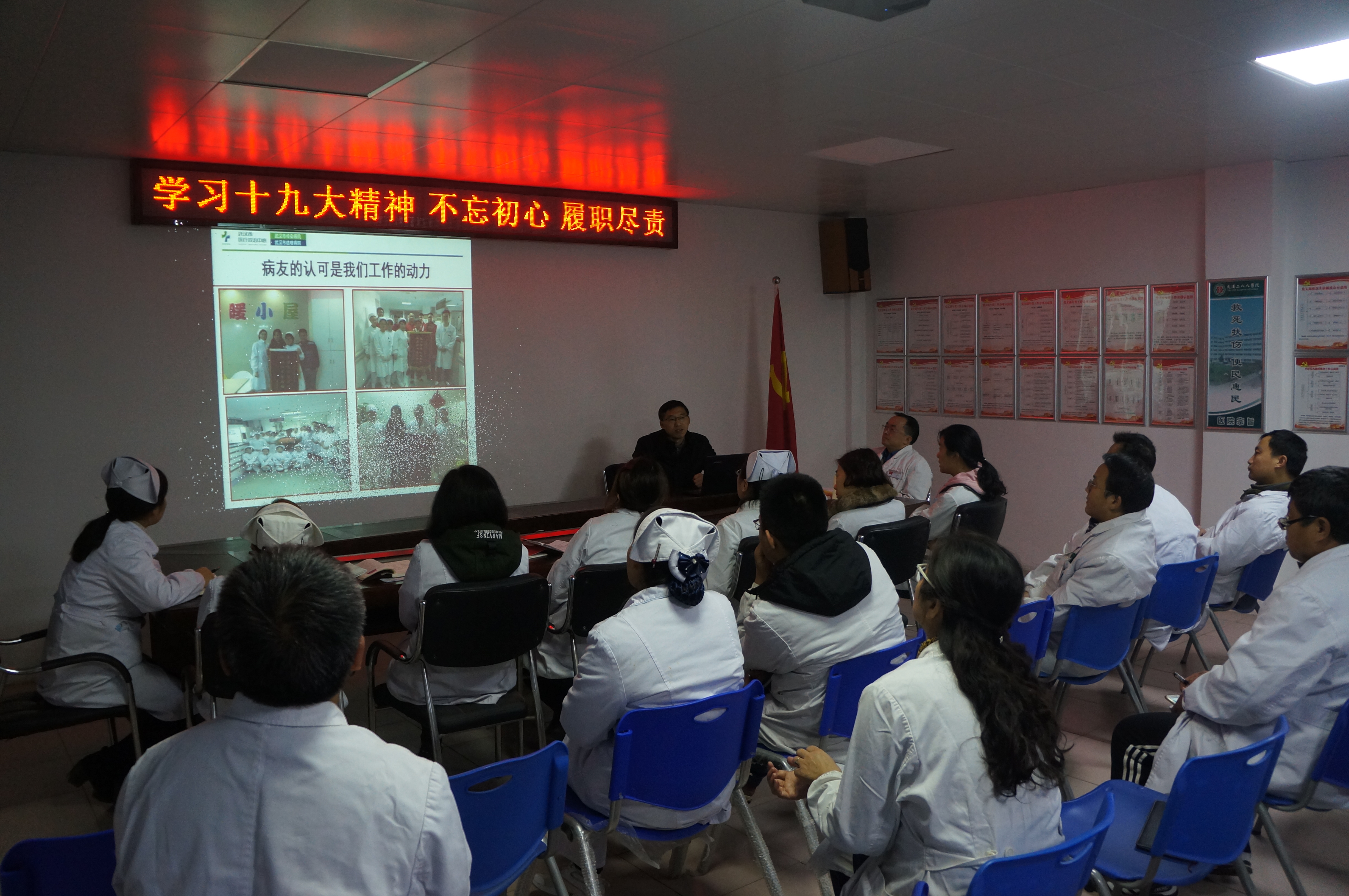 武汉二八八线上德州扑克平台 党支部副书记侯爱东感谢阮连国主任的精彩讲课,他希望党员干部立足本职工作,学思践悟十九大,争做新时代医护标兵。