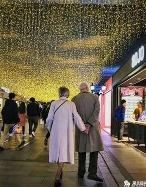 汉街上。两位老人穿着时尚,如果不是满头银发,还真像逛街的小年轻。老爷爷手背在身后,牵着老奶奶的手,宛若热恋中的情侣。